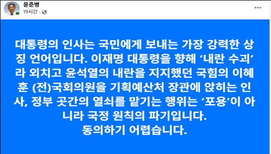 윤준병 더불어민주당 의원은 28일 ‘이혜훈 국민의힘 전 의원을 기획예산처장관에 내정’한 사실과 관련, “포용이 아니라 국정 원칙을 파괴하는 행위로 동의하기 어렵다”고 비판했다.윤 의원은 이날 자신…