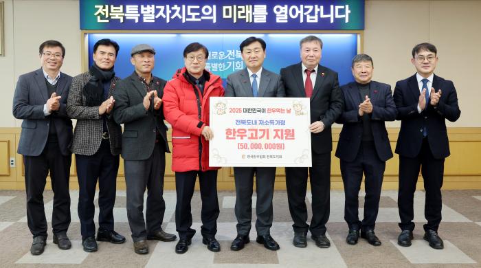 전북도는 8일 도청에서 (사)전국한우협회 전북도지회가 도내 저소득층을 위해 5,000만원 상당의 한우고기를 전북사회복지공동모금회에 기탁했다고 밝혔다.이날 기탁식에는 김관영 전북특별자치도지사, 정윤…