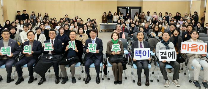 책의 도시 전주의 다양한 독서문화 공동체들이 한자리에 모여 지난 1년 동안의 활동 성과를 공유했다.전주시는 8일 전주시립도서관 꽃심에서 한 해 동안의 도서관 운영 성과를 돌아보는 독서문화공동체 한마…
