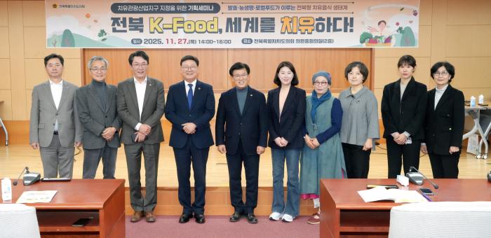 전북특별자치도의회 의원총회의실에서 이명연 의원(더불어민주당, 전주10)이 주관한 전북 ‘K-Food 세계를 치유하다!’ 치유관광산업지구 지정을 위한 기획세미나가 27일 치유 음식관광활성화 연구회 위원, …