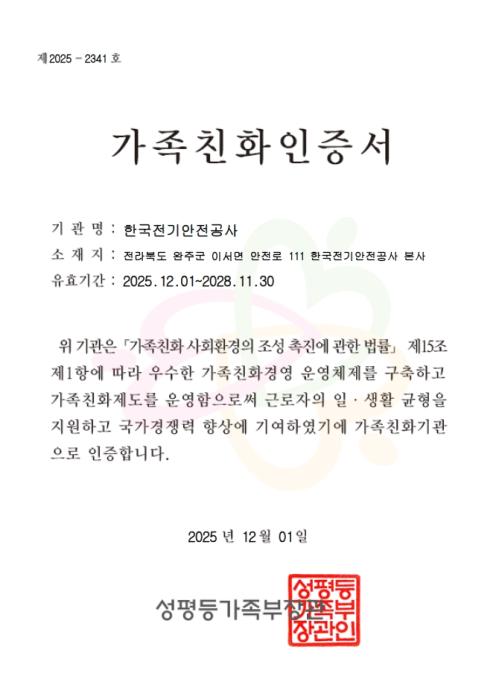한국전기안전공사가 12년 연속 ‘가족친화인증기관’에 선정됐다.11일 한국안전공사 남화영 사장은 성평등가족부에서 주관하는 ‘가족친화인증기관’에 12년 연속 선정되는 쾌거를 이뤘다고 밝혔다.가족친화…
