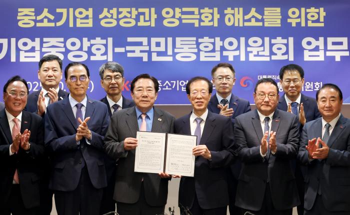 중소기업중앙회(회장 김기문)는 국민통합위원회(위원장 이석연)와 1일 여의도 중기중앙회 리더스룸에서 업무협약을 체결했다.이날 협약식에는 △김기문 중기중앙회장과 △권혁홍 수석부회장 △배조웅 수석부…