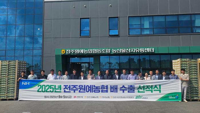 전주원예농협 관내에서 생산된 2025년 햇배 베트남 수출 기념 선전식이 지난 9월 5일 진행됐다.이정환 전북농협본부장, 임종경 전주원예농협조합장은 "수출을 통해 품질 좋은 전북산 배의 안전성·품질을 강…