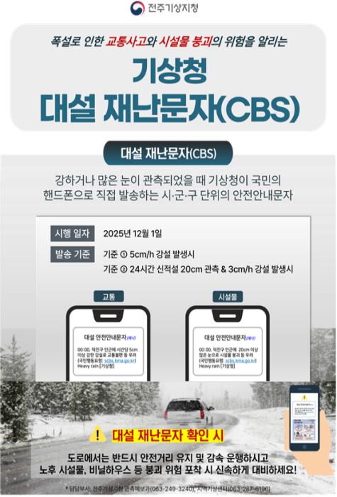 2025.12.01부터 전북도민을 대상으로 ‘대설 재난문자’ 발송 서비스가 시범 운영된다.‘대설 재난문자’ 서비스는 대설에 의한 교통사고 및 시설물 피해에 따른 것이다.이에 따라 전주기상지청에서는 전북…
