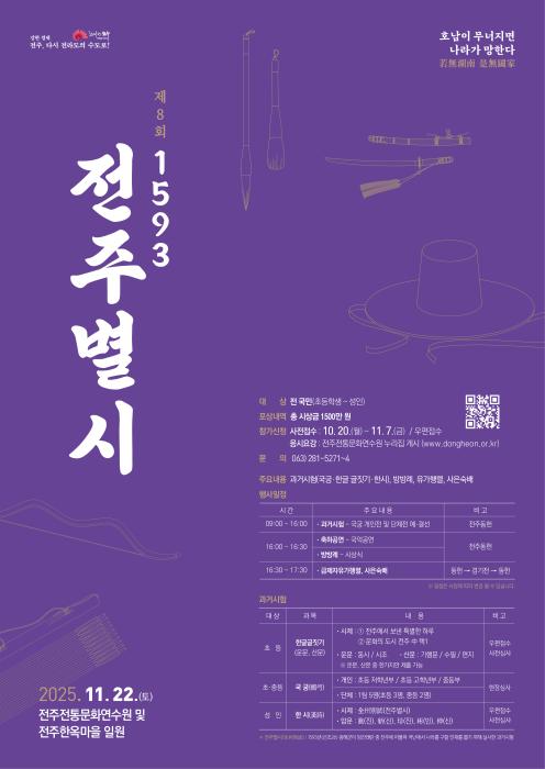 전주시는 오는 22일 전주전통문화연수원과 경기전 등 전주한옥마을 일원에서 ‘제8회 1593 전주별시 재현행사’를 개최한다.시는 전주의 역사적 사실을 바탕으로 지난 2017년부터 ‘1593 전주별시’ 재현행…