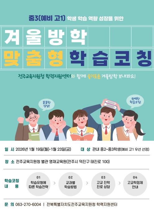전북특별자치도전주교육지원청(교육장 채선영)은 학교급 전환기를 맞은 중학교 3학년 학생들의 학습 공백을 최소화하고, 성공적인 고등학교 안착을 돕기 위해 ‘겨울방학 맞춤형 학습코칭’을 운영한다고 15…