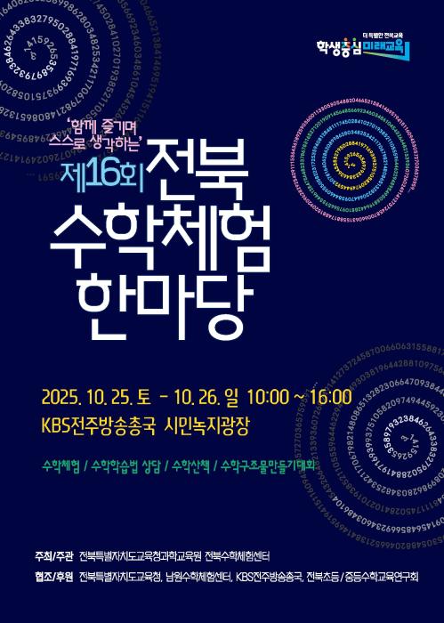 전북특별자치도교육청과학교육원(원장 강진순)은 오는 25일부터 26일까지 KBS전주방송총국 시민녹지광장에서 '제16회 전북수학체험한마당'을 개최한다고 22일 밝혔다.전북수학체험한마당은 보고·만지고·생…