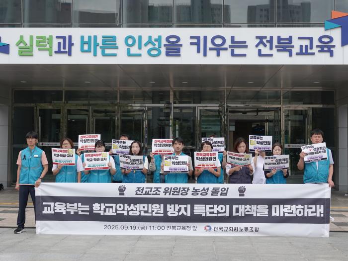 박영환 전국교직원노동조합(전교조) 위원장이 학교 현장에서의 악성 민원 해결을 요구하며 19일 전북교육청에서 농성에 들어갔다.박 위원장은 농성에 앞서 이날 전북교육청에서 기자회견을 열고 "전북의 한 …