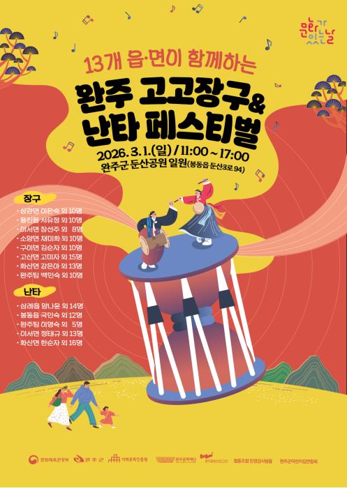 완주문화재단(이사장 유희태)은 오는 3월 1일 완주군 둔산공원 일원에서 13개 읍·면이 2026 완주 고고장구&난타 페스티벌을 개최한다.이번 축제는 한국 고유의 타악기인 고고장구를 현대적으로 재해석…