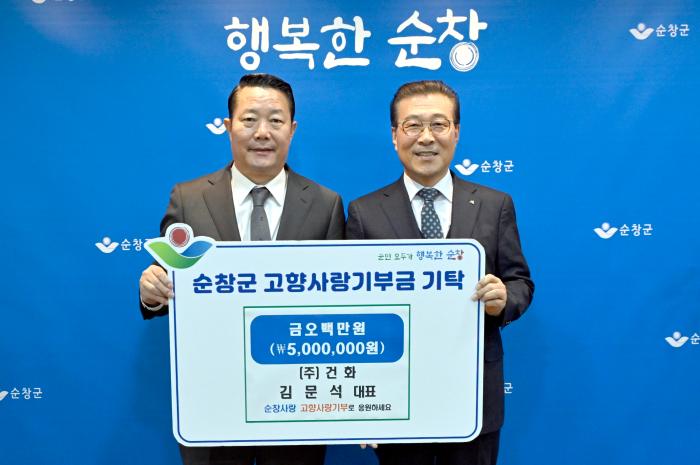 순창군은 15일 ㈜건화 김문석 대표이사가 순창군에 고향사랑기부금 500만원을 기탁했다고 밝혔다.1990년에 설립된 ㈜건화는 체계적인 설계 개선에 따른 성과를 인정받아 32회 한국가치경영대상에서 산업부 …