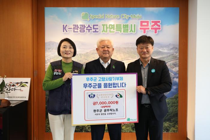 전북특별자치도 완주군 공무직 노조(전국자치단체 공무직본부 완주군지부)원 70명이 31일 무주군에 고향사랑기부금 7백만 원을 기부했다.이날 무주군을 찾은 김상곤 완주군 공무직 노조위원장은 “도내 지자…