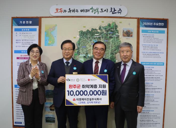 완주군 봉동읍에 소재한 티엔제이건설(주)이 지난 5일 완주군 장애인 체육회에 온누리 상품권 1,000만 원 상당을 기부하며 완주군 장애인 체육발전과 취약계층 지원에 힘을 보탰다.티엔제이건설은 1997년 설…