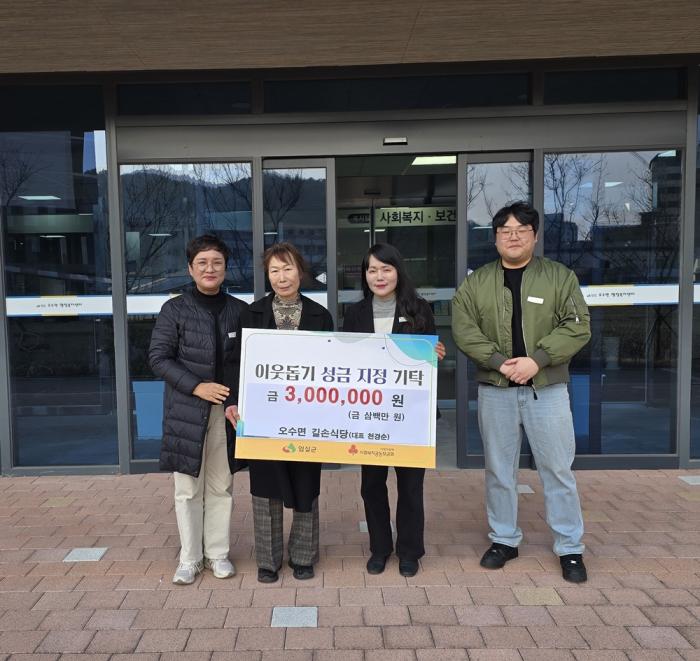 임실군 오수면 길손식당(대표 천경순)는 지난달 29일, 설명절을 맞아 지역 내 어려운 이웃을 돕기 위해 성금 300만원을 오수면사무소에 기탁했다.이번 성금은 지역 내에서 오랜기간 사랑받아온 길손식당이 …