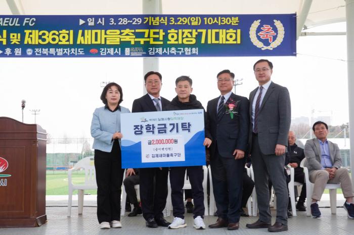 김제사랑장학재단은 지난 29일 김제시를 대표하는 생활체육 동호회인 김제새마을축구단(회장 김태현)이 창단 50주년을 맞아 장학금 200만원을 기탁했다고 밝혔다.장학금 기탁은 ‘김제새마을축구단 창단 50…