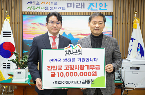 진안군은 지난 7일 진안군청에서 ㈜제이에이치테크 김종헌 대표가 고향사랑기부금 1천만 원을 전달하는 기탁식을 가졌다고 밝혔다.이번 기탁식에는 ㈜제이에이치테크 김종헌 대표가 참석해, 진안군 발전과 …