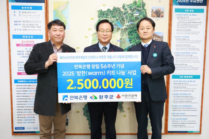 전북은행(은행장 백종일)이 연말을 맞이해 완주군청에 취약계층을 위한 ‘2025 방한(Warm) 키트’ 60상자(250만 원 상당)를 전달했다고 18일 밝혔다.이번 전달은 겨울철 한파와 난방비 부담으로 어려움을 겪…