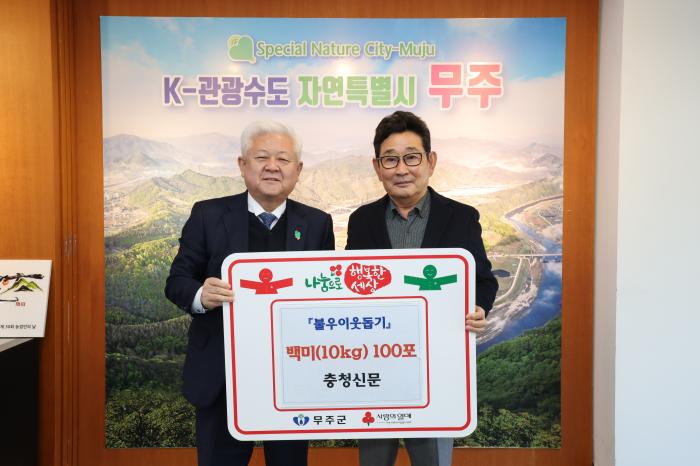 충청신문 김충헌 대표(사장)가 지난 9일 무주군에 쌀 100포대(1포대 10kg)를 기탁해 관심을 모으고 있다. 이날 기탁된 쌀은 사회복지공동모금회를 통해 6개 읍면 어려운 이웃들에게 고루 전달될 예정이다.무…