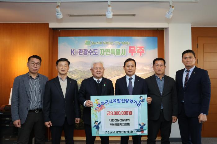 대한전문건설협회 전북특별자치도회 관계자들이 지난 2일 무주군청을 방문해 (재)무주군교육발전장학재단에 장학금 3백만 원을 기탁했다.임근홍 대한전문건설협회 전북특별자치도회장은 “무주 학생들의 꿈 …