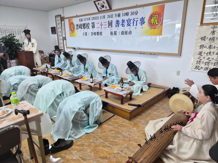 남원시 운봉읍 운봉향교는 11월 26일(화) 오전 10시 30분 충효관에서 제23회 기로연(耆老宴) 행사를 개최했다. 이번 행사는 운봉향교 유림과 지역 어르신을 초청해 80세 이상 어르신들의 건강과 장수를 기리…