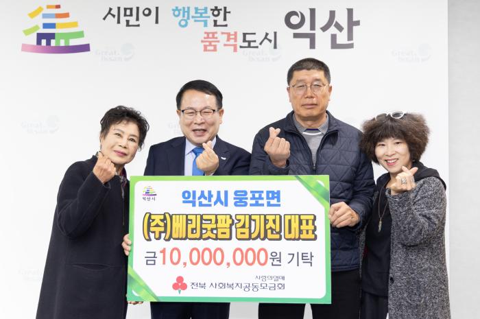 익산시 웅포면에 위치한 농업법인 ㈜베리굿팜의 김기진 대표가 1일 시청을 방문해 성금 1,000만 원을 기탁했다.김기진 대표는 2008년부터 매년 이웃사랑을 실천하며 지역의 '기부천사'로 불리고 있다. 김 대…