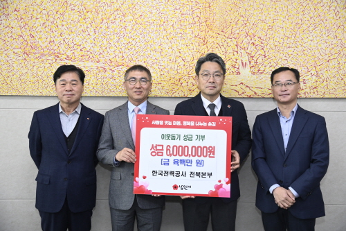남원시는 한국전력공사 전북지역본부(본부장 연원섭)에서 연말을 맞아 지역사회의 취약계층을 위한 성금 6백만 원을 기부했다고 밝혔다. 성금 전달식은 11월 27일, 남원시 부시장실에서 연원섭 전북지역본부…