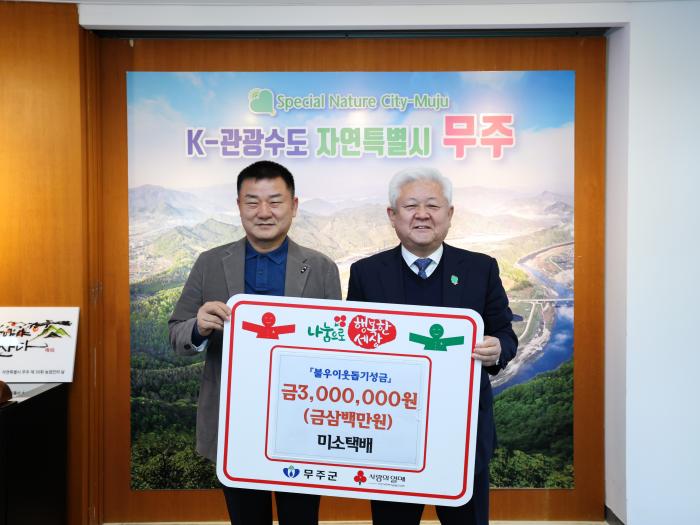 ‘미소택배’ 김인철 대표가 27일 무주군에 이웃돕기 성금 3백만 원을 기탁했다. 무주군청에서 진행된 이날 기탁식에는 무주지역자활센터 권삼일 센터장을 비롯한 관계자 등 10여 명이 함께 했다.김인철 대…