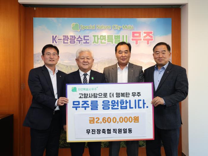 무진장축협 임직원들이 무주군에 고향사랑기부금 260만 원을 기탁했다. 이날 기탁은 3년 연속 고향사랑기부제 동참이라는 점에서 큰 관심을 모으고 있다.지난 11일 무주군청 군수실에서 열린 기탁식에는 황…