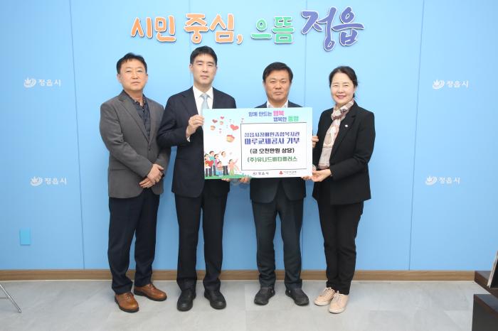 정읍시는 지난 18일 ㈜유니드비티플러스(대표 한상준)가 정읍시장애인종합복지관의 노후 시설 개선을 위해 5000만원 상당의 마루 교체 공사를 무상 지원하기로 하고 기탁식을 가졌다고 밝혔다.기탁식에는 한…