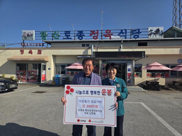 남원시 운봉읍 소재 황산토종정육식당 신명철 대표는 지역사회 복지 증진을 위해 300만원을 기부하며 따뜻한 나눔의 손길을 내밀었다.이번 기부금은 운봉읍 지역사회보장협의체의 특화사업에 사용될 예정으…