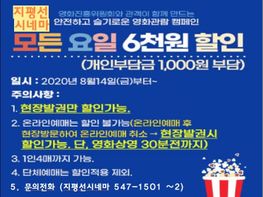 영화진흥위원회가 극장과 관객이 함께 만드는 안전하고 슬기로운 영화관람 2차 캠페인 '일상 속 영화두기'의 새로운 시작으로 모든영화 6천원 할인권을 제공한다. 김제지평선시네마는 작은영화관으로 8월14일...