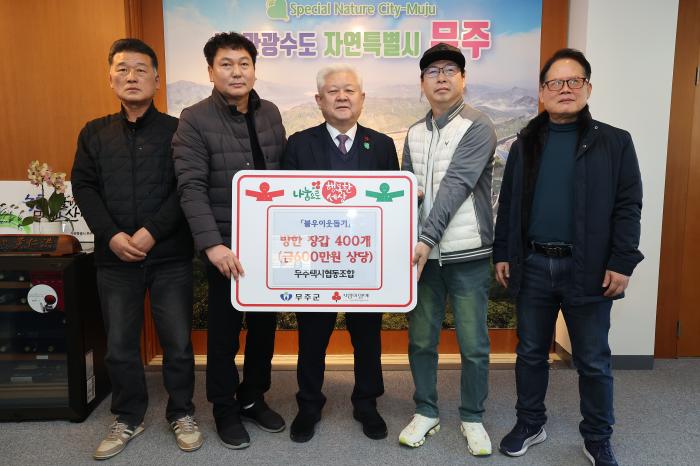무주택시협동조합은 지난 1월 30일, 방한 장갑 400세트(6백만 원 상당)를 무주군에 전달했다. 이번 기탁은 지역 내 어르신들의 따듯한 겨울나기를 돕기 위한 것으로 지역사회에 훈훈함을 전하고 있다.김현섭…