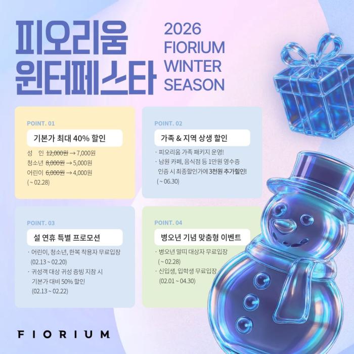남원시(시장 최경식)의 복합문화공간 피오리움이 겨울 시즌 관람객의 문화비 부담을 덜고 접근성을 높이기 위해 오는 2월 28일(토)까지 ‘윈터페스타’를 진행한다.우선, 겨울 방학 시즌을 맞아 기획된 이번…