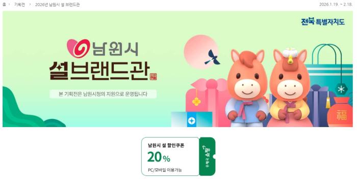 남원시(시장 최경식)는 민족 최대 명절인 설을 맞아 2월 18일(수)까지 우체국 쇼핑몰(mall.epost.go.kr)을 통해 농특산품 판촉 프로모션을 진행한다고 밝혔다.남원시는 매년 설과 추석 명절에 지역 농특산물…
