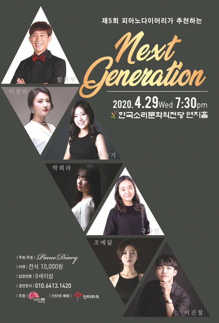 또한, 오는 4월 29일 한국소리문화전당 연지홀에서는 5번째로 Next Generation 유망주 신인음악회가 열리는데 구아인(전주예중), 이진철(전남대), 박슬기(동덕여대), 박희라(경희대), 조예닮(전주대), 이찬미(전주대), 함의영(전주대)등 쟁쟁한 피아니스트들이 기량을 펼칠 예정이다.