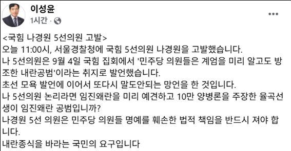 민주당 이성윤 의원은 이날 이재강·김동아 의원과 함께 서울경찰서를 찾아 고발장을 제출하며 “나 의원은 김민석 총리와 민주당 의원들의 명예를 훼손한 것에 대해 반드시 책임을 져야 한다”고 말했다.