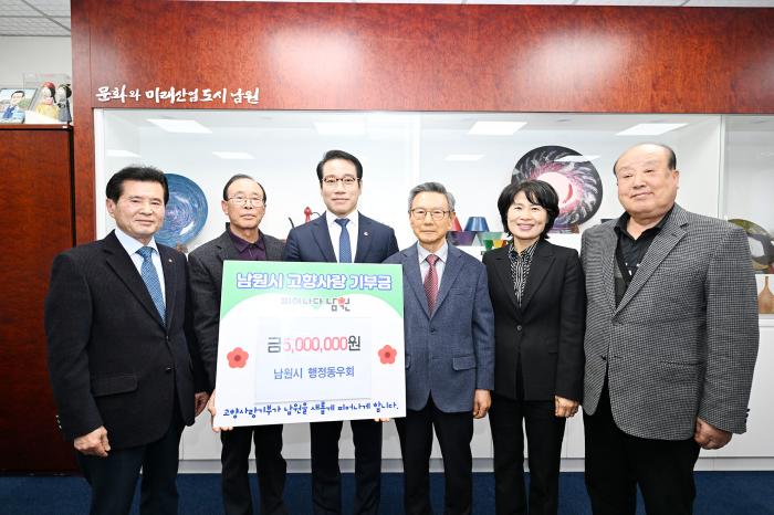 남원시 행정동우회는 행정공무원 퇴직자 모임으로 2023년부터 매년 자체적으로 성금 모으기 사업을 추진해 2024년과 2025년에 각각 500만원씩 이웃돕기성금을 전달하는 등, 지역사회에 따뜻한 온정을 나누는 데 앞장서고 있다.