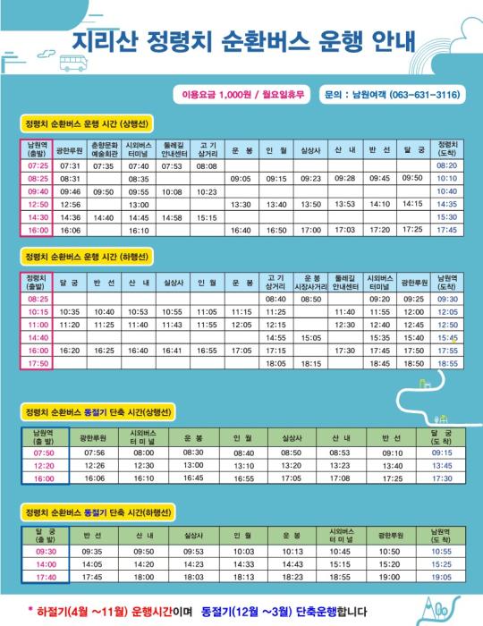 남원시 관계자는 “동절기 통행 제한이 해제됨에 따라 봄철 지리산을 찾는 관광객들을 맞이할 만반의 준비를 마쳤다”며, “많은 분이 저렴하고 편리한 순환버스를 이용해 남원의 아름다운 자연경관을 만끽하시길 바란다”고 전했다.