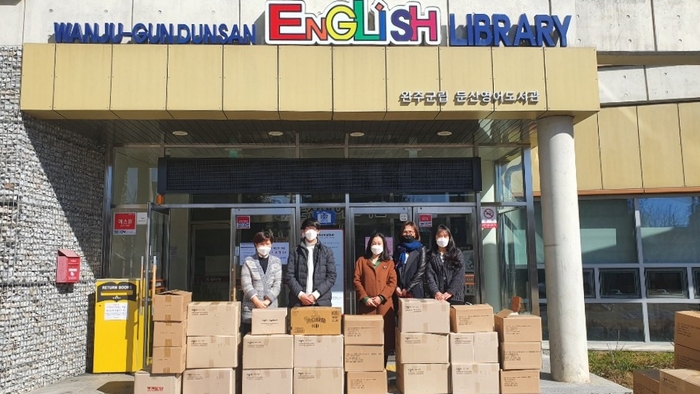 완주군 둔산영어도서관이 ㈜옴니시스템 사회공헌사업으로 기증받은 도서를 관내 사회복지시설에 전달했다.