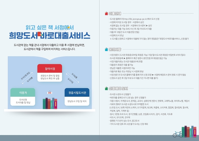 이에 따라 시민들은 읽고 싶은 책이 정읍시립중앙도서관에 없는 경우 정읍시립도서관 홈페이지(lib.jeongeup.go.kr)에 접속해 희망 도서를 신청하면 지정한 서점에서 3일 이내 책을 받아 볼 수 있다.