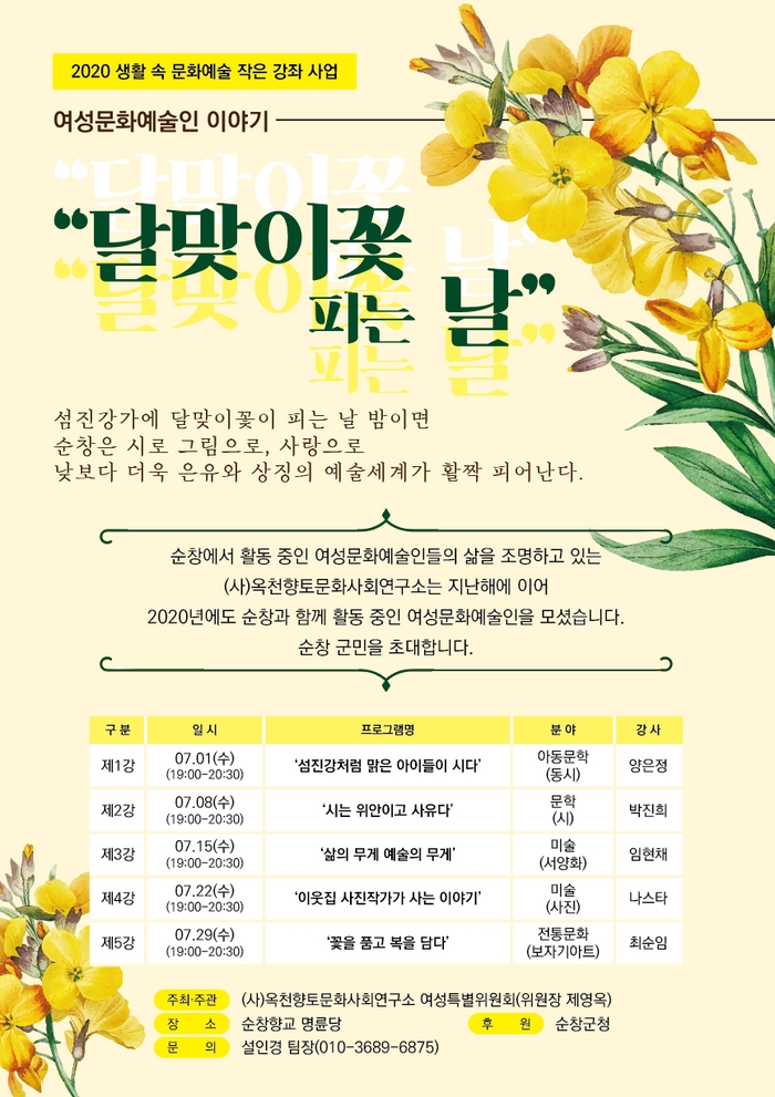 ‘달맞이꽃 피는 날’을 주제로 열리는 이번 강좌는 전체 5개 강좌를 5명의 순창 출신의 작가들과 순창을 무대로 활동 중인 작가들이 마이크를 잡는다.