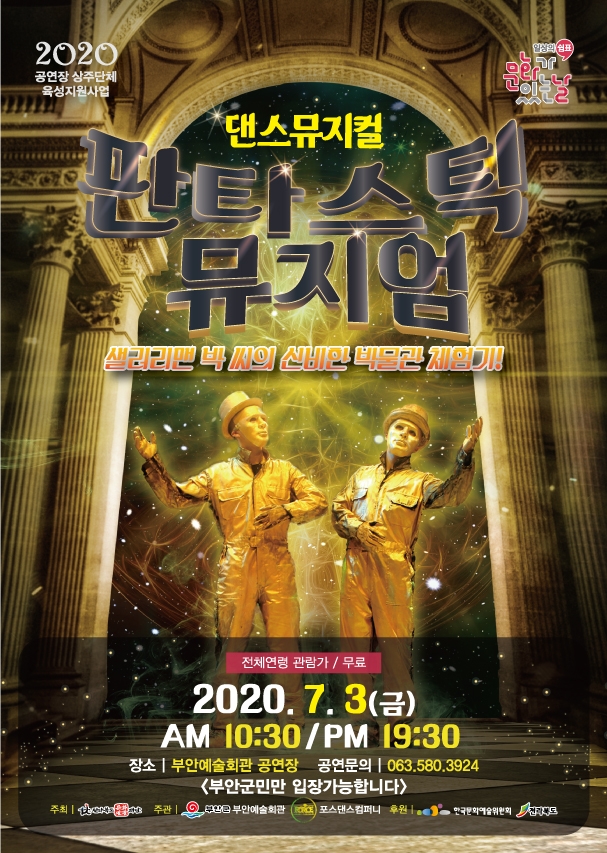 부안군(군수 권익현)은 올해 공연장상주단체 육성지원사업으로 추진하고 있는 기획공연 '판타스틱 뮤지엄'이 오는 7월 3일 오전10시 30분, 오후7시 30분 부안예술회관 2층 공연장에서 펼쳐진다.