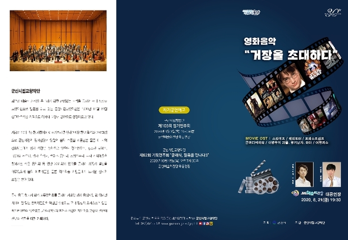 군산시립교향악단 상임지휘자 백정현의 지휘와 팬플룻 신광섭의 협연으로 진행되는 이번 연주회는 한 시대를 주름잡았던 인기 영화 속 메인 테마곡들로부터 최근 영화들의 배경 음악들을 웅장한 오케스트라의 선율로 감상할 수 있다.