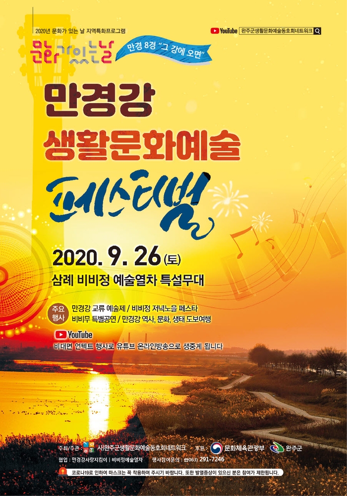 완주군생활문화예술동호회에서 기획과 운영을 맡아 진행하고 있으며 문화가 있는 날 세 번째 행사로 ‘만경강 생활문화예술 페스티벌’을 유튜브 실시간 스트리밍을 통해 만날 수 있다.