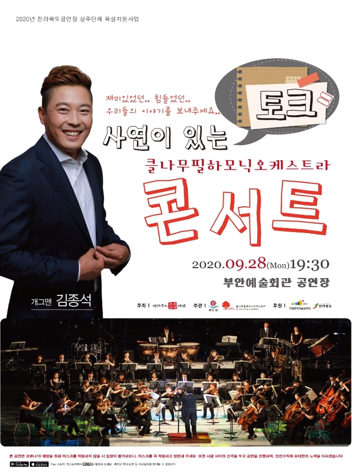 부안군(군수 권익현)은 '사연이 있는 클나무필하모닉오케스트라 콘서트'가 9월 28일 오후 7시30분 코로나 확산 방지를 위해 비대면(무관중)으로 유튜브 라이브 채널에서 공연을 선보일 예정이다.