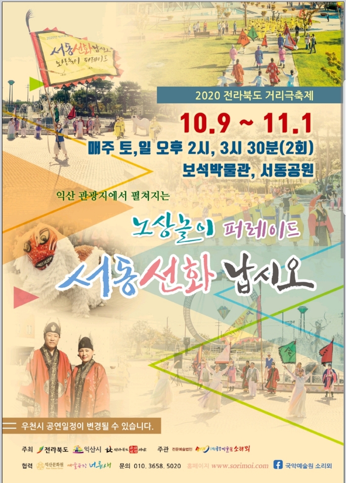 전라북도 문화 관광재단에서 후원하는 2020년 전라북도 거리극 축제 '노상놀이 퍼레이드' 사업이 전문예술법인 소리뫼 주관으로 익산 관광지에서 주말상설 공연으로 실시된다.
