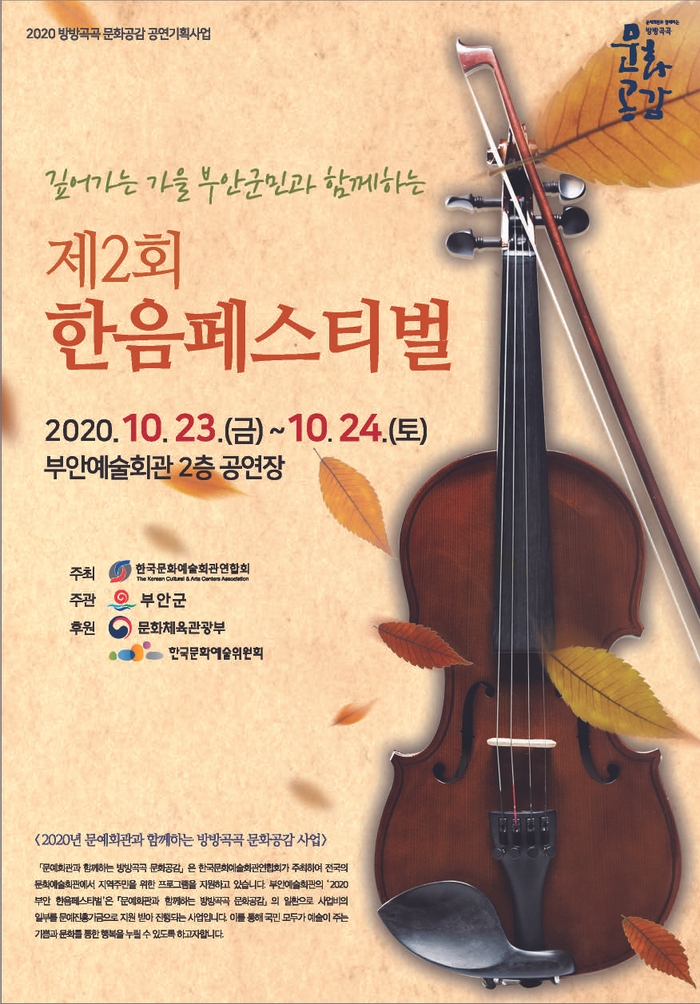 부안예술회관이 “2020 방방곡곡 문화공감 –문예회관 기획 프로그램 지원사업 선정되어 오는 10월 23일부터 10월24일까지 부안예술회관에서 제2회 부안 한음페스티벌이 개최된다.