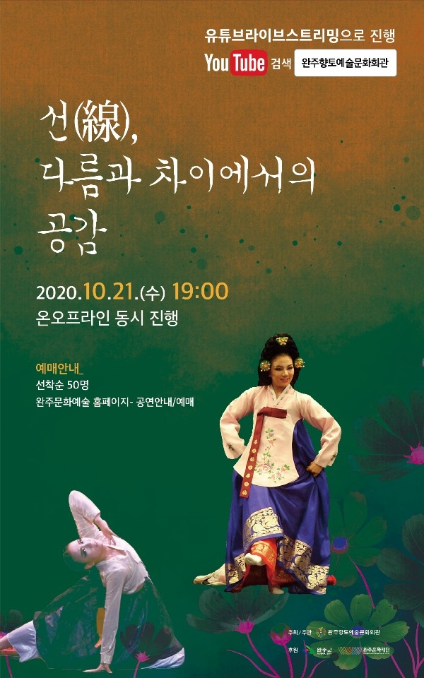 완주향토예술문화회관(관장 이재정)은 코로나19 확산세가 주춤해지고 사회적 거리두기가 1단계로 완화되면서 오랜만에 온·오프라인 동시에 기획공연 ‘선(線) , 다름과 차이에서의 공감’을 선보일 예정이다.