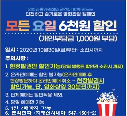 김제시 문화홍보축제실(실장 서원태)담당 부서인 지평선시네마는 사회적거리두기 1단계 시행에 따라 오는 10월 30일부터 극장과 관객이 함께 만드는 안전하고 슬기로운 영화관람 2차 캠페인 '일상 속 영화두기'의 시작으로 모든영화 6천원 할인권을 제공한다.