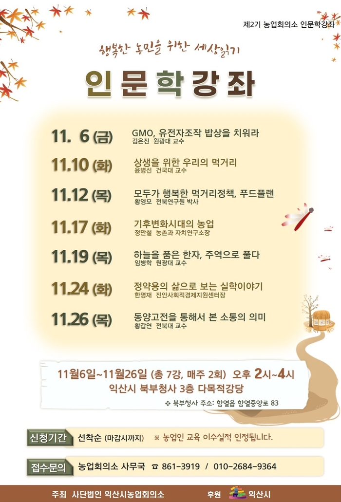 익산시농업회의소(회장 김선태)는 오는 6일부터 26일까지 총 7강으로 오후 2시부터 4시까지 2시간씩 익산시북부청사 3층 다목적강당에서 농민을 위한 인문학강좌를 개설하여 수강생을 선착순 모집중이다. 강좌는 익산시에 거주하는 농민이면 누구나 참여 가능하고 익산시농업회의소에 전화로 신청하면 된다.Copyrights ⓒ 전북타임즈 & jeonbuktimes.bstorm.co.kr, 무단 전재 및 재배포 금지