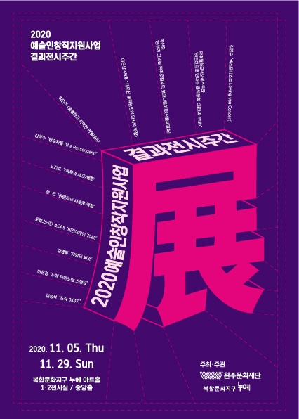 (재)완주문화재단(이사장 박성일)이 지역예술인의 창작활동을 지원하는‘2020예술인창작지원사업(이하 창작지원사업)’의 결과전시주간을 11월 5일부터 29일까지 복합문화지구 누에 아트홀에서 진행한다.